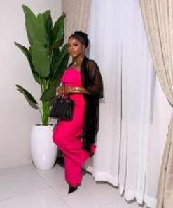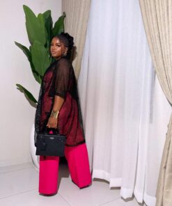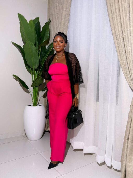 | Style | Sheer Overlay Kimono with Strapless Magenta Bodysuit and Wide-Leg Pants |