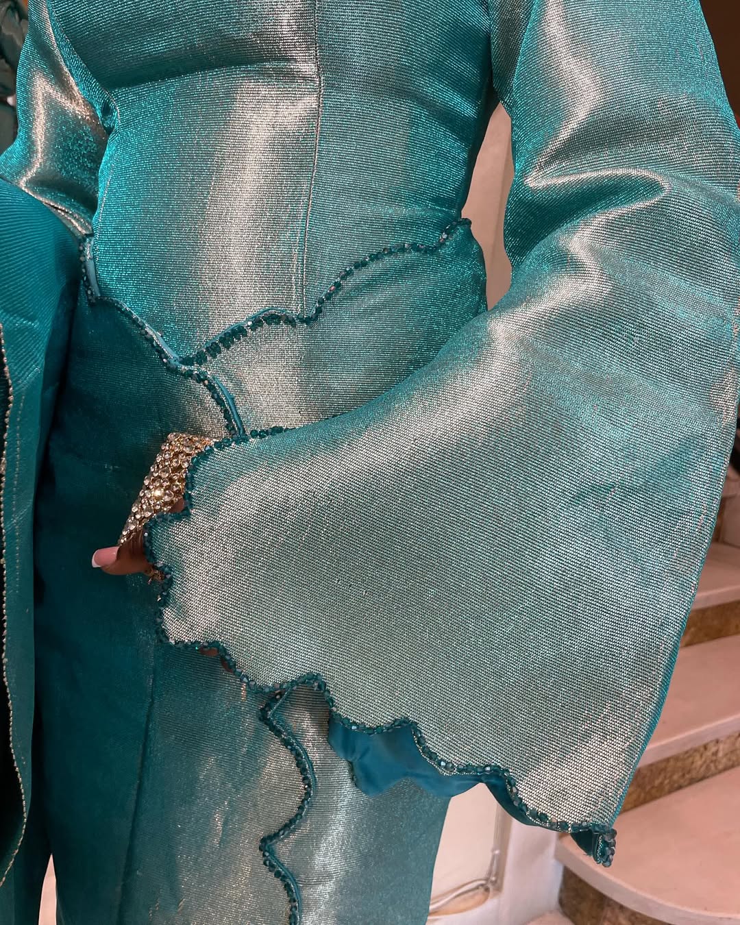 Perfect for Yoruba weddings, traditional engagements, cultural celebrations, and special events, this outfit blends cultural pride with a flattering, contemporary silhouette. The exquisite scalloped sleeve edges and wave-patterned front seam add a touch of artistry, while the luxurious texture ensures comfort and style.