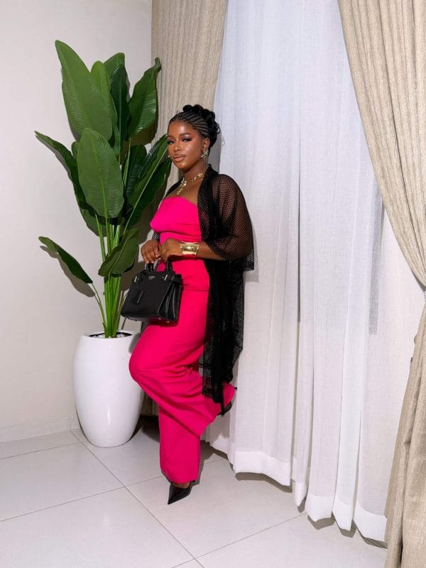 The BREEZ set from Bojamiley includes wide-leg trousers, a black mesh kimono, and a bodysuit. The mesh kimono adds an architectural element that makes the outfit look editorial, while the bodysuit and trousers keep everything streamlined underneath. This is especially strong for a cocktail-style reception or an evening wedding celebration.